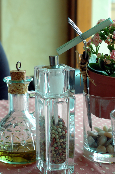橄欖油跟香料(忘記問是甚麼香料)研磨罐,旁邊的叉子上放著這次的帳單,滿別致的方式。