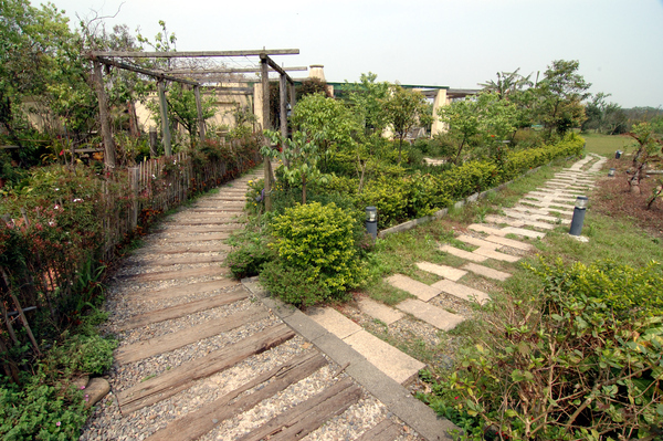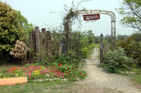 進入後看到隱隱約約的建築物,左邊順著枕木就是餐廳的主體,餐廳前種了很多的香草植物,一區一區的自然生長,有點雜亂卻又充滿了生命力,我很喜歡這種自然的感覺。