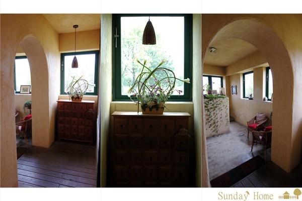 這是要進入廁所的通道,明亮的光線從窗外照射進來,五斗櫃上擺上著花束,我喜歡這種明亮對比的感覺。