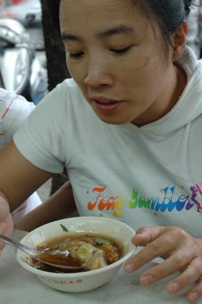 飢腸轆轆的我們,一上桌就迫不急待的送進嘴裡,好吃!好吃!魚肉真的好吃,可是喝湯下去,好甜喔............,Woodstock 在旁邊笑,這就是台南小吃特別的口味。