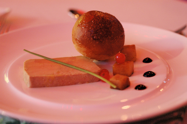 第一道美食上桌了,"香煎阿爾薩斯鴨肝昨可可醬",一大片鴨肝搭配一塊法式麵包,旁邊用蘋果、黑醋栗及可可醬當佐料。