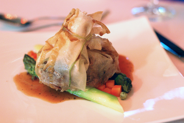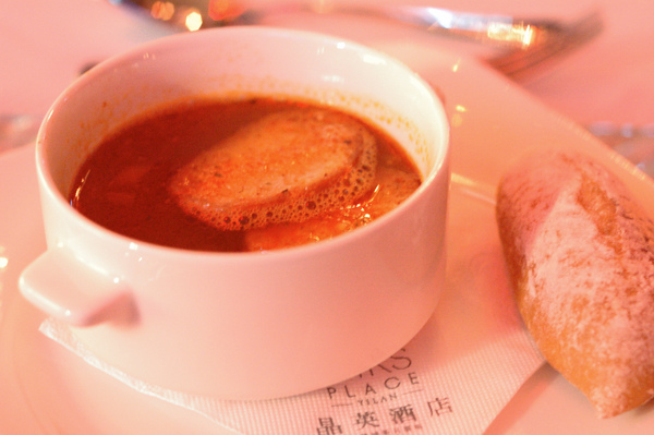 第二道是"普羅旺斯馬賽海鮮湯",湯上面漂浮著兩片蒜味法國麵包,湯的味道香濃,喝上一口香檳,香檳強烈的味道不見了,也壓過海鮮的腥味,很不錯喝,海鮮湯也很棒。