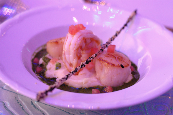 第三道是"諾曼地干貝明蝦佐奶油青醬",這是最好吃的一道菜,對於海鮮很挑的本人,趁熱把干貝明蝦都下肚了,干貝明蝦底下的馬鈴薯泥相當的好吃,青醬味道應該是我吃過裡面最棒的。
