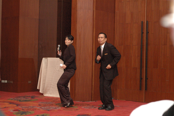 主持人跟講酒師也不是只有上台主持跟講解的功能,當宴會氣氛 High 到不行時,還必須在角落帶動一下氣氛,我們那天字第一桌的貴賓,可能是被這兩人所感染的吧!
