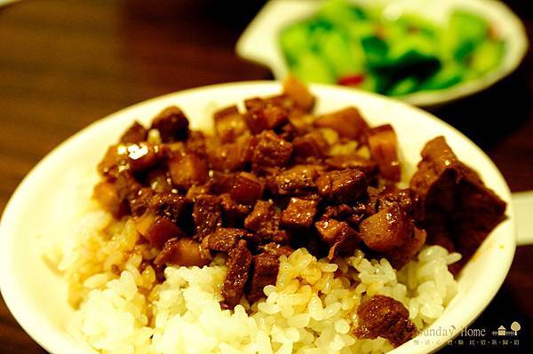 滷肉飯上桌了,這滷肉飯的肉是用切的,好吃的滷肉飯一定要一刀一刀切,才會方正肥瘦各半,四八高地的滷肉已經算是不錯了,但是還是自己家裡的最好吃。