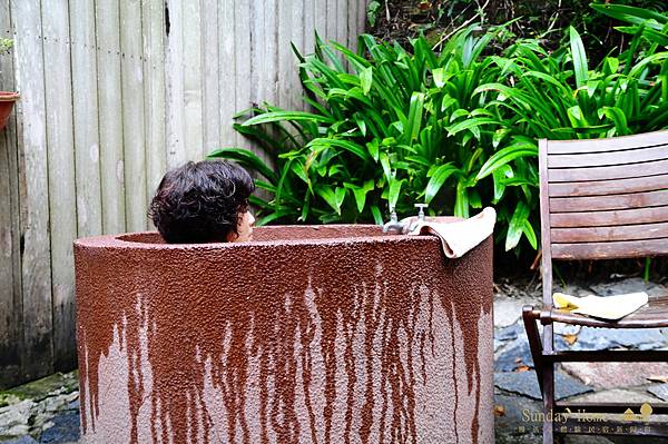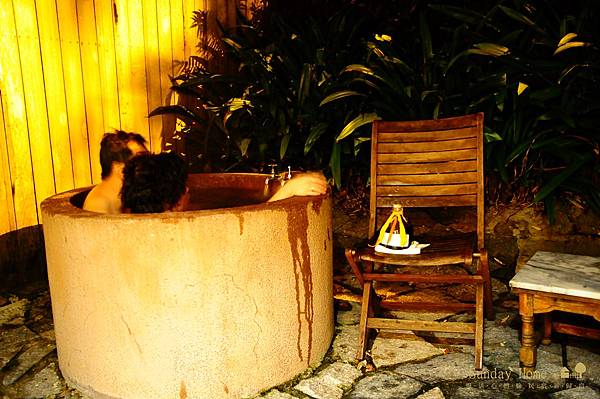 戶外有兩人可以共浴的浴缸,喝完下午茶離晚餐還有一點空檔,當然得讓疲憊的身心輕鬆一下囉!