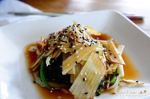蘋果絲涼拌青菜,淋上調味過的醋及橄欖油,微酸的口味還滿下飯的。這次吃到的是A菜,青菜會依照老闆買的菜調整。