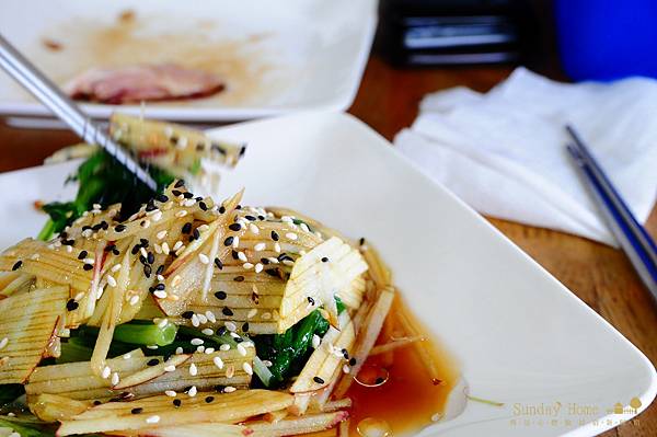 蘋果絲涼拌A菜,這不是在餐廳吃到的料理,是一家非常非常不起眼的小路邊攤提供的料理,好吃嗎?說真的還真不賴。