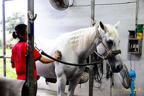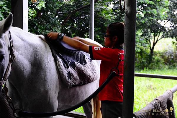 人著裝完畢後,再來就幫馬準備裝備,首先是刷毛,先將馬匹身上刷乾淨,放上汗墊、馬鞍,裝好馬蹬及馬蹬帶,最後裝上韁繩,花了一番工夫,終於將馬匹準備好。