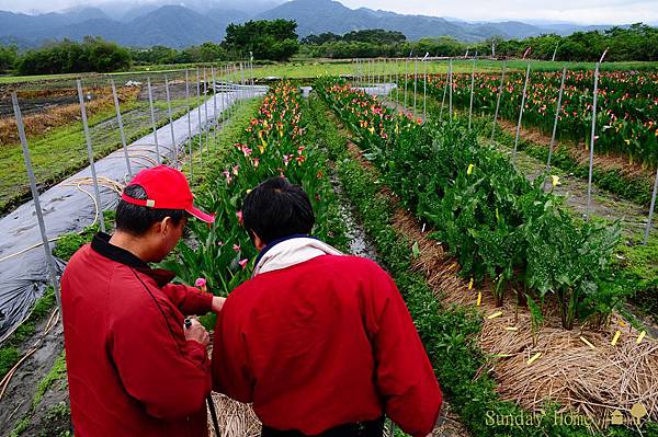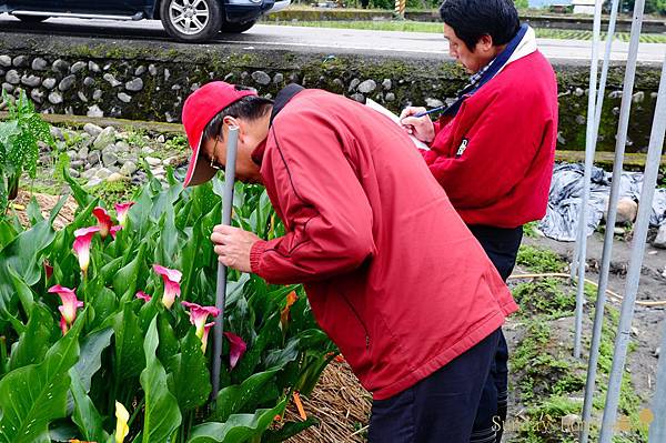 過沒多久來了兩位農改場的研究人員,他們是來協助農民朋友栽種彩色海芋,只看他們在位花朵作詳細的記錄,台灣農業就是靠他們在進步的,辛苦了。