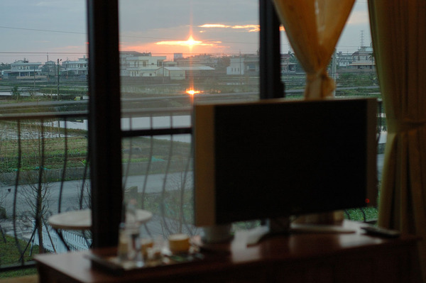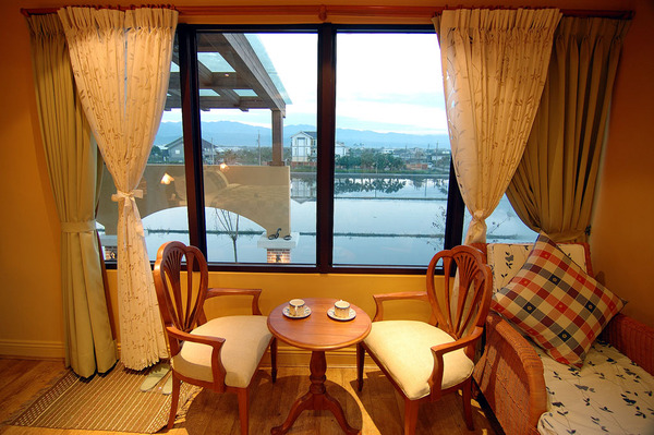 窗外的水田,正值二期稻作休耕期,放滿水的田地,營造出湖泊般的風味。